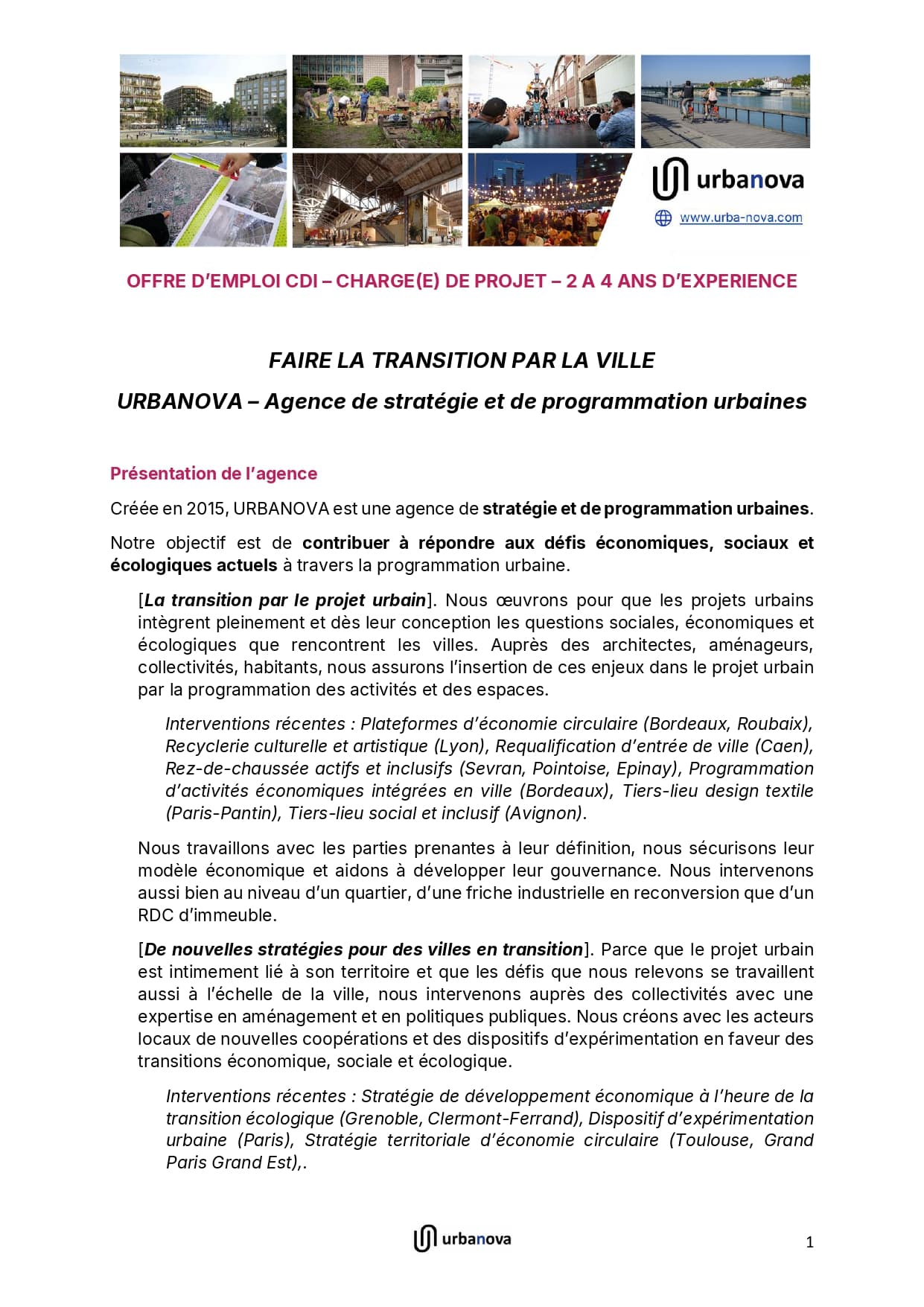URBANOVA recrute UN(E) CHEF(FE) DE PROJET de 2 à 4 ans d’expérience, à Lyon